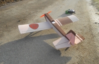 Po řádném odležení opraveno a znovu zalétnuto. Opravdu hodný cvičný model. Ještě nemám doladěné výchylky, ale přemet, výkrut, let na zádech zvládá v klidu. Motor neznámého čínského původu tu váhu zvládá s dostatečnou rezervou.