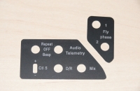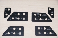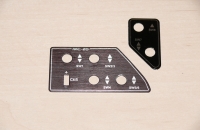 S tím jsem se nespokojil a začal vymýšlet, jak vypínače popíši. První pokus, přelepit původní popisky nápisy vyřezané ze samolepky moc nevyšel. Plotr, který písmenka řezal, nebyl schopný tak malá písmenka kloudně vyřezat. Další varianta byla nechat si vytisknout samolepku včetně popisků o přesné velikosti pole s vypínači. To už bylo lepší, ale i když jsem matice vypínačů dotahoval s citem, samolepka se buďto kroutila hned a nebo, při opravdu mírném přitažení se vypínače vrklaly. Škoda, a to jsem si dal dost práce s návrhem v různých programech, aby nápisy po vytištění, byly v měřítku destiček na které se nalepí, byly vystředěné a vypadalo to pěkně.