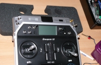 Přinesl jsem mu odloupnuté štítky, návrh v programu CAD a za dva týdny bylo hotovo. Chybí tam sice nápis Graupner a ozdobná jakoby lišta kolem ale to neva. Dokonce mi udělal i další variantu rozložení určitých funkcí, to kdyby mi „nešly do ruky“ (D/R a MIX) sesazování už byla pohoda. Ještě jsem vyměnil pár třípolohových vypínačů za dvoupolohové, samozřejmě originál Graupner , ať to vypadá a tady je výsledek. Na výstavě v Letňanech jsem ještě koupil takové různobarevné „šprcky“ na vypínače pro ještě lepší orientaci a tím jsem s dokonalostí spokojen