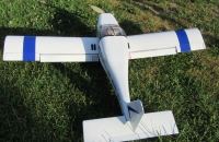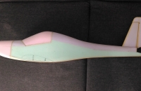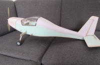 Model je stavěn jako malý bráška k třímetrové maketě dolnoplošníku MF 01. Křídlo profil M 701 jako u skutečného letounu, říznuté ze styroduru, olištované balsou, taktéž křidélka a dvoupolohové vztlakové klapky. To samé VOP, která je plovoucí, zavěšená na vydličkách s kovovými čepy. Jelikož startuji z ruky funkční SOP je zablokována. Trup, skořepina ze styroduru, v rohách balsové nosníky, to vše potaženo papírem, natřeno několika vrstvami ředěného Herkulesu a nastříkáno acryl srej. Model byl zalétán na půjčený 3S 1000mAh. Jelikož letové vlastnosti se ukázaly více než dobré i v utažených zatáčkách, osadil jsem tříčlánkem 2200mAh. Přestože práce s tímto materiálem( Styrodur) je celkem příjemná, na další model si ji raději odpustím a vrátím se ke klasice. Jakákoli ostrá tráva je schopna udělat vryp do povrchu modelu což zamrzí.