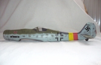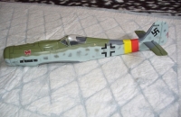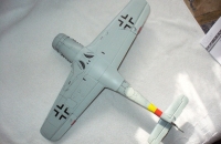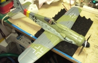 Mám oblíbené letadla typu Focke Wulf ... Byl jsem zvědav jak bude létat tento a neodolal jsem. Koupil jsem jej na inzerát již trochu rozpracovaný (přilepené servo výškovky a přišroubovaný motor). Stříknul jsem červený a žlutý pruh na trup, kokpit, výfuky, chladič, podvozek, namaloval pilota. Nanesl obtisky a tuší v technickém peru (lihový fix za čas zfialoví, tak jsem zkusil něco jiného) jsem zvýraznil paneláž a nýty. Křídlo jsem nechal sundavací. Zajímavé také je, že na tomto menším modelu je více detailů než-li najeho větší sestře (FW 190D, D jako Dora) od toho samého výrobce. Ke stavebnici dodávaný regulátor Turnigy Plush 6A mi i možná mou vinou nechodil dobře. Motor jsem připájel přímo na regulátor (možná jsem při pájení trochu víc rego ohřál?). Byla spíš náhoda, že se motor rozběhl. Stále vypadával ze "synchronizace". Pokusy o změnu časování regulátoru přes vysílač byly marné. Dostal jsem se do menu, ale změna se nechtěla provést. Vyměnil jsem Turnigy za Jeti ADVANCED 04 , změnil jsem časování a motor se vždy v pořádku rozběhne.