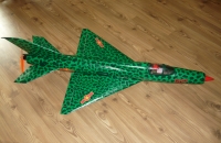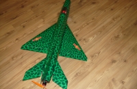 Model Migu je postaven z xps Austrotherm a je potažen látkou vlizelin prosycenou bezbarvým lakem.Kamufláž, je z období Vietnamské války natřena vodouředitelnými barvami Etertnal,kabina je z petlahve od cocacoly.Jedná se o druhý model, ten první nelétal moc dobře,klonil buď na levou, nebo na pravou stranu, a byl dost nestabilní za letu, i přes veškeré možné pokusy, jsem ho nakonec rozlámal do koše, a začal se stavbou znovu, jen jsem zvětšil rozpětí křídla z 650 na 740 mm.S větším rozpětím už létá o dost lépe,jen na přistání se musí jít na vyšší rychlosti.Jestli budu ještě někdy stavět jednadvacítku,zvětším rozpětí tak na 900 mm a rozhodně bude ve stříbrné barvě z těch zelených skvrn jsem měl po třetím dnu malování migrénu.