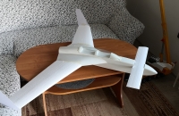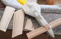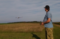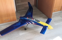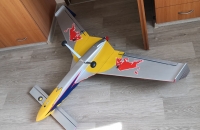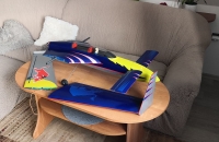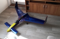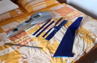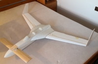 Toto éro jsem dokončil a zalétnul už v polovině září, ale nějak jsem zatím ještě neměl čas se o něj s Vámi podělit. Táta sháněl delší dobu lam. trup na model Donald a když ho konečně sehnal ukázalo se, že ten pán má i trup na tuhle "kačenku". Je to tak zvláštní éro, že jsem si řekl, že ho prostě musím mít. Jedná se o polomaketu amerického ul. letounu Rutan LongEZ, a v tomto zbarvení v USA i létá. Jinak ke stavbě: křídla a VOP jsou říznutá z polystyrenu, polepená balsou, povrch je potažen papírem a vše je stříkáno spreji+ nějaká ta ručně řezaná samolepka. Nosníky v křídlech jsou ze smrkových lišt a křídla jsou nasunutá na uhlíkové trubce, vinglety jsou konstrukční z balsy. Řízení jsem řešil klasicky- výškovka na kachní ploše vpředu a křidélka vzadu, bez mixů. Zálet byl trochu oříšek, jelikož jsem k trupu dostal i jakýsy plánek( nebo spíš nákres) s těžištěm, snažil jsem se polohu těžiště dodržet a model jsem dovažoval( a to byla chyba). První pokusy o vzlet jsem sotva odlepil čumák od země. Nakonec jsem z nosu vydoloval všeno závaží a i baterku jsem posunul víc dozadu, takže těžiště je nyní na náběžce přesně v místě kde přechází lam. trup na křídlo.( tedy daleko za místem uvedeným v nákresu) Nyní je let s tímto modelem paráda, je stabilní při jakékoli rychlosti, a ani při staženém plynu a pomalém přitahování se mi ho nepovedlo utrhnout do vývrtky, jen si pomalu prosedá.Ani start bez směrovky a bez řízeného předního kola není problém, pár metrů a je ve vzduchu. Hodně lidí mě varovalo že se tomuhle éru nechce moc létat, ale pokud je těžiště tam kde má být tak je to super polétání.