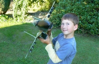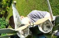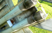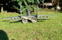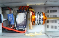 Motor mám asi netypicky umístěn mezi nasávacíma otvorama a dále hnací hřídelí v délce cca 27cm vyvedenou v zadní části letadla kde je na gumový unašeč uchycena tlačná vrtule Towerpro 7x6 elektro Kupodivu se podařilo a model ani při plném plynu nijak zvlášť nevibruje a nedrnčí z čehož jsem měl díky konstrukci nemalou obavu. :-)