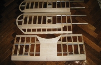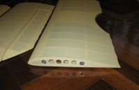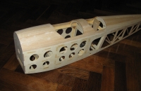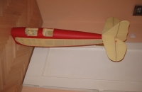 Základem výřezy od CNCHC, trochu upraveno. Např. křídlo bylo vcelku, při daném rozpětí trochu velké sousto. Proto jsem ho rozdělil, ne uprostřed ale zhruba na třetiny, protože mi bylo líto zrušit pečlivě promyšlený centroplán s několika nosníky určujícími vzepětí. Centoplán tedy zůstává trvale na trupu a do něj se na trubky nasouvají konce křídel. Montáž je tak na dvě minuty a bez nástrojů.