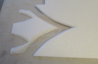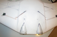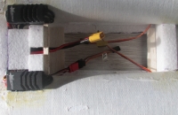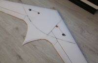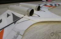 Spodky motorů ze předu olaminátoval (80g) skelnou tkaninou,aby netrpěly při přistávání! Jako výztuhu křídla jsem ještě použil karbonové tyčky(3mm),ale na konce oblouků křídla dal jako výztuhu(3mm) uhlíkovou pásnici,abych vytvořil negativy!