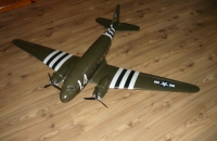 Na vánoce jsem prováděl generální úklid dílny a šuplíků,ze kterých jsem vytáhl mimo jiné dva střídavé elektromotory BM 3130, které již nebyly v nejlepší kondici.Rozhodoval jsem se jestli je zahodit, nebo ponechat.V televizi nedávali nic co by mne zajímalo, tak jsem si pustil dvd se seriálem Bratrstvo Neohrožených od Stevena Spielberga, no a nápad byl na světě.Motory jsem zase vytáhl z šuplíku a opravil tak aby dál sloužily k pohonu dvoumotoráka.trup modelu jsem vyřezal z kulčkového bílého polystyrenu a potáhl hnědou lepící páskou,zasklení jsem udělal z obalů od starých cd.Ještě musím vymyslet jak dodělat astrokopuli.Křídla jsou z xps a potažena vlizelinem,celý model je natřen barvami eternal a přelakován lesklým bezbarvým lakem, marking jsem zvolil z období invaze do evropy, kdy tato letadla přepravovala výsadkáře, a materiál ve všech výsadkových operacích druhé světové války.Létá velmi dobře,je to dopravák takže na žádnou akrobacii to není stavěné,výkon motorů na běžný provoz stačí půl plynu jen při stoupání a do zatáček se musí přidat.