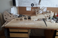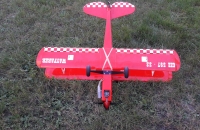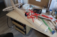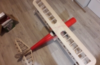 Na „Outerzone“ jsem tuším předloni narazil na plán modelu „Wayfarer“ od Dona Deweye a moc se mi zalíbil. Díky ochotě p. Haly z fy. „Lasermodely“,který mi na model vypálil díly jsem se mohl pustit do stavby. Oproti pův. koncepci pana Haly(elektropohon) je model upraven pro pohon spalovákem,má zesílenou přední část trupu pro mot.lože + z balzy „vysochaný“ kryt motoru. Kvůli lepší aerodynamičnosti je motor umístěn invertně. Křidélka jsou ovládána samostatnými servy. Kýlovka, směrovka a výškovka jsou z plné balzy,vylehčené kruhovými otvory,stabilizátor konstrukční. Křidélka konstrukční,potažená balzou. Trup je také potažen balzou.