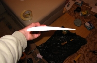 19.3.10: Při záletu se projevila spousta nedostatků. Po dovážení a úprave úhlu seřízení to docela pěkně klouže, ale špatně se řídí. Z toho důvodu jsem doplnil 16cm uši z 4 pronu, zahnuté do profilu. Rozpětí se zvětšilo na 1,9m a plocha na 30dm2. Vzhledem k minimálnímu nárůstu váhy (10g) kleslo i plošné zatížení na 18,9g/dm2. Jak to poletí uvidíme...