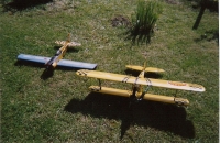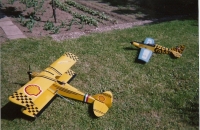 Kdysi jsem začal stavět křídlo od Čmeláka a lenost vedená vlastní fantazií z toho vytvořila tohleto...Práškovací letadlo nového tisiciletí...Psal se rok 2000.Létá jak z původními křídly, tak i s akrobatickými o rozp. 900 mm(pak je z toho hotliner a překročit 150 km/h není problem).Vyzkoušel jsem na něm i křídla ze zde uveřejněného modelu Lucky o rozp.2000 mm.Je to má zkušebna křídel a motorů.Lože motoru je univerzální, od 1,5-2,5 3,5a a strop je 4,6 ccm.Takže chci li blbnout vezmu krátké křídlo( na adrenalin) nebo dlouhé do termiky, no a na práškování mám to čmelákovské..to druhé foto je z křídlem z pyloňáku..