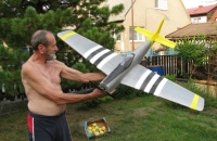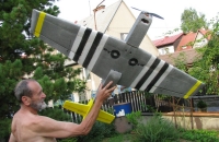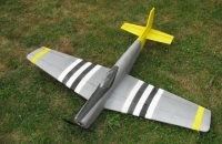 No tak je to okopírovaný Mustang od pana Šplíchala který k maximální spokojenosti létá již dva roky,tato sranda vznikla jako pokus o dobře lítající větší letadlo a opět se naprosto vyplnily představy. Model dokže letět krokem a je stále stabilní,1,5m polomaketka létající metr nad zemí je hezké podívání. Křídlo je klasické konstrukce ale místo fólie je potaženo 3mm plátem EPP. Trup je slepen z 10,12 a 15mm EPP.