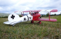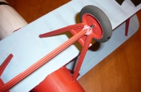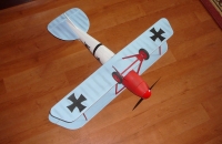Tak dnes jsem se osmělil a dopoledne jsem jej zalítal.Naprostá nádhera,motor má přebytek výkonu,tak jsem hned po startu ubíral co to šlo.Je stabilní,klouže perfektně.A vlájící šála za pilotem nesmí chybět !!! Jen jsem ještě vyztužil podvozkové nohy,na naohýbaný drát pr.2 mm jsem natáhl smršťovačku,zafoukal pistolí a přilepil jsem to vtěřinovým lepidlem.Pevnost je špičková,asi to ustojí i dvrdší přistání.Ještě jsem přidal gumičky na odpružení,ty originál zpuchřeliny ze stavebnice nic neustály.