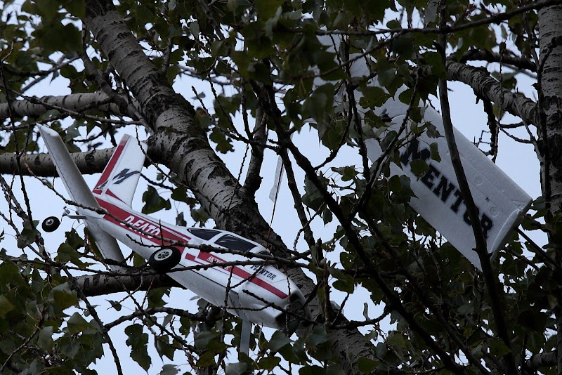 NEW: Při jednom podvečerním lítání v říjnu 2009 za silnějšího větru jsem špatně odhadl vzdálenost otočky ( myslel jsem si že točím PŘED stromem ale vlivem šera a dost silného snosu modelu po větru ) jsem nalítl přímo do koruny stromu nějakých 15 metrů nad zemí :(( Náraz byl na křídlo, to se rozlomilo ale díky plastovým šroubům odtrhlo od trupu aníž by se jakkoliv model jinak poškodil. Zůstal zaklíněný spolu s nepoškozenou druhou půlkou křídla a ještě visel na prodlužce od serva. Takhle by tam asi i zůstal, nebýt šikovného kamaráda, který pracuje ve výškách a který mě model spustil dolů na zem včetně křídel :) Dopadlo to tedy nakonec dobře, nové křídlo jsem objednal spolu s drobnými díly a brzy bude Mentor zase brázdit nebe nad hlavou :))