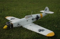 Asi před rokem jsme s kámošem hledali nějaký plánek letadla, které bude zvládat aircombat. Vybírali jsme něco jednoduchého na stavbu a našli již zmíněný model. Stavba až na pár drobností probíhala docela hladce. Zbarvení jsme volili podle toho jakou barvu Oracoveru jsme schopni sehnat tak, aby to alespoň trochu odpovídalo skutečné předloze. Takže volba padla na sněhově bílé zbarvení. Po předchozích neúspěšných pokusech o vzlet, které byly způsobeny špatnou polohou těžiště (Pozor na ni!!!! U plánku je chybně napsaná!!!) a chcípáním motoru se Messerschmitta podařilo dne 28.9.09 dostat do vzduchu. Ač jsme tomu moc nevěřili tak model se vznesl a letěl jako správný aircombaťak.Zatím jsem nezkoušel co všechno dovede, ale za tu chvíli ukázal, že to bude pravý bojovník. Na 2,5 ccm lítá pěkně svižně jako skutečné letadlo. Průlety v malé výšce jsou jedna báseň. Při druhém letu jsem při přistaní zlomil vyškovku, protože letadlo se zaseklo o přepážku motoru a udělalo kotrmelec.Vše už je ale opraveno a může se zase vydat do boje. Jen, ale musí počkat na protivníka!!!