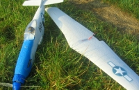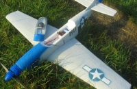 Přišel čas Mustanga umístit, mám ho od jara, ale nějak nebyl čas. Není třeba popisovat, neboť kdo by neznal modely LM. Létá výborně a nezáludně. Popíši pouze změny, které se liší od manuálu. Předně jsem křídlo osadil 2 servy oproti původnímu řešení. V kabině je mnohem více místa. Kryt motoru byl vyroben pouze dočasně, protože jsem si myslel, že s tím hned křápnu a bude po něm. Naštěstí se mé obavy nevyplnily a tudíž vypadá poněkud divně stále. Ze staré slánky jsem vyrobil imitace výfulů motorů, které současně slouží jako odvětrání regulátoru a věřte, že větrat třeba je. Musel jsem je však oproti originálu posunout více ke kabině, aby splnly svůj účel. Výškovku se mi podařilo nalepit vzhůru nohama (ne nejsem idiot, jen když se se stavbou začíná, tak jsou oba otvory pro kabinu i pro křídlo bílé, motor tam ještě není, směrovka jakbysmet. A já s tím furt točil, točil, a točil , pak přilepil a ku.....Na letové vlastnosti to však nemá žádný vliv. Křídlo mám sundavací na plastový šroub, funguje bez problémů. Pilota jsem si vyrobil sám (spíš vystrouhal a vybrousil - můj první pokus) z obi polystyrenu. Kabina je taky na plastový šroub, ale na menší než původní.