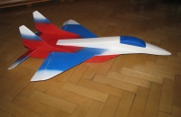 Model je celý postaven z desek tl.6mm nařezaných z extrudovaného polystyrenu,trup je zesílen také pomocí extrudovaného polystyrenu,dodává modelu ladnější tvary.Mig je lepen celý purexem,některé části epoxidem.V křídle jsou zalepeny 2 uhlíkové nosníky,kvůli pevnosti a náběžné hrany na křídle a výškovce jsou zpevněny pomocí balzových lišt.Model je celý vytmelen šlehaným tmelem ONETIME a nastříkán barvami BALAKRYL.