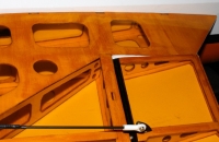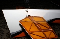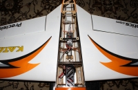 Stavba (spíše dokončení modelu) byla příjemným doplňkem několika večerů u televize, žádné záludnosti. Oproti návodu jsem jen použil jinou výbavu (HC), kulové čepy na páky křidýlek a plandající provázky ke směrovce nahradil uhlíkovým táhlem od serva, nově umístěného vzadu. Původně mělo být umístěně v kabině. Řízené kolečko natvrdo zalepené do směrovky bylo podezřelé už od pohledu. Po několika jeho ulomeních už při stavbě, jsem jej udělal odpružené. A kryty předních kol snesly větší kolečka :)