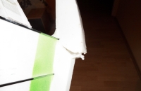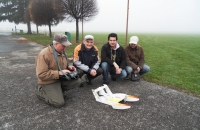Tak a už je pokrstený.... po štarte sa vzopäl a nekontrolovane padol kolmo na zem. Po oprave musíme posunúť ťažisko výrazne dopredu oproti návodu a vyosiť motor smerom nadol. depron je na takúto stavbuveľmi krehký. lepší by bol EPP,hoc aj trochu ťažší. Na fotke je kompletná zostava realizačného teamu.