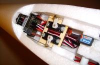 Serva pro křidélka nejsou na obvyklém místě před křidélky, ale jsou zalepena v kořenu křídla a křidélka jsou naháněna zabudovaným bovdenem, takže serva nevykukují nad povrch křídla. Serva ve Foxovi mají na sobě sice standardní konektory Futaba, ale u nás je spíše zvykem osazovat standardní JR/Hitec konektory. Chtěl jsem do přijímače na pozice kanálů pro obě křidélka dát 2 krátké prodlužky, abych se nemusel při připojování kabelů od serv v křídlech trefovat na ne úplně dobře přístupné piny. Nakonec jsem konektory na servech upravil nožem tak, aby se vešly bez problémů do Hitec konektorů. Drží dobře. Mohu tak kabely z křídel zapojit rovnou do pěkně přístupných prodlužek. Zatím jsem se nedostal k osazení vypínače, což doporučuji.