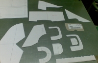 Sablony- pre kridla z Al plechu, striham ich obycajnymi noznicami, zvysne sablony z tvrdeho papiera, asi 1mm hruby, su to dosky na zvazovanie dokumentov,projektov a podobne. K epp ich pripevnujem dlhymi krajcirskymi spendlikmi.