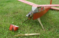 Motor je "Déčkový", laicky diesel. Ten šroub na hlavě slouží k seřízení kompresního poměru, ve válci je tzv. protipíst, jehož malým posouváním měníš kompresi. Tím se ladí chod motoru. Druhým ladícím prvkem je jehla karburátoru, která, jak už zde kolega psal, chybí. Pokud jí nenajdeš, bylo by možné to nahradit, asi bych zkusil jehlu i tryskou z MVVS 1,5D (byl podobné koncepce). Výrobce motoru pocházel z NDR (pro mladší ročníky - východní Němci). Zkus si sehnat někde ultrazvukovou čističku na brýle a tam motor dát. Postupně můžeš po uvolnění odmontovat jednotlivé díly a motor tak očistit. U pístu a ojnice si dej pozor, abys je namontoval ve stejné poloze. Je možné na dno pístu (nikoliv pracovní plochu) udělat lehkou rýhu pilníčkem, podobně ojnice. Při obrácené montáží bys motor nemusel rozchodit. Palivo není etyl s ricínem, ale petrolej s eterém a ricinem, blíže si najdi na RC Mánii, je k tomu vícero vláken. Protož tenkrát nebyl RC soupravy, létalo se volně, proto žádná kormidla. Když se podíváš na RC Revue do reedice plánků Modelář, najdeš tam několik letadel podobné kategorie (Citabria, Praga E-114M, Taylor F-2). Aby to neulétlo, dávala se malá nádrž, řádově kolem 5 - 15 ccm (podle velikosti motoru). Seřízení letu - stoupání např. v pravýcbn kruzích, kluz (po zástavě motoru) v levých, či obráceně. Tak držím palce při renovaci a napiš výsledek + foto.