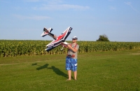 Samozrejme som sa musel najprv riadne ukludniť, desaťkrát napraviť šiltovku od nervozity ale potom som povedal že už stačilo a išiel som na vec. Pomaly som pridával plyn, Twin sa krásne pobral za motorom a po pár metroch šup vo vzduchu a bolo to. Nič hrozné sa nedialo, nebolo potrebné nič trimovať, model letel ako na lajne. Pádovka nulová. Po plnom pritahnutí model nikam neprepadával len klesal dole. Nič sa nedialo, až som bol prekvapený. Let bol veľmi prijemný, model lieta neuveritelne svižne a dúfam že sa s ním len dobre zžijem. Zalieta všetko na čo som si v daný moment pomyslel. Po asi 5 minútach som šiel na pristátie. Model som nasmeroval na dráhu a pomaly sťahoval plyna jemne naťahoval, model začal krásne a poslušne vytrácať výšku a dosadol ako do perín.