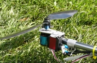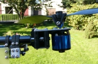 7.9. udělal jsem nový yaw mechanismus s ložiskama. Jedná se o část hlavní hřídele ze 450 vrtulníku, která je asi 2 cm zalepená do trubky. Lepeno epoxidem s nasekanou uhl. tkaninou. Držák motoru je z ložiskových domečků hl. hřídele také ze 450. Chodí to perfektně, přesně, nesrovnatelně lépe než kluzné uložení. Snížily se vibrace a celkově je model mnohem lépe ovladatelný. Také jsem dal hezčí kabinku, v letu to vypadá jako vážka :). Všechny trubky jsem zkrátil asi o 8 cm, bylo to zbytečně moc velký a stabilita je pořád parádní.