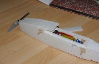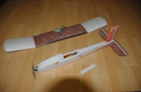 10.09.2010 prvý zálet. Trocha silnejší vietor, ale letelo to. Ale s vetrom niesu žarty, jeden silný poryv a lietadlo plesklo o zem a tak sa mi podarilo zlomiť trup vpredu, ale už je to zalepené a vystužím to uhlíkom z hora aj z dola trupu, mal som to pôvodne v pláne. Motor absolútne stíha, bez problémov vystúpal, takže obavy o jeho sile / do 300 g váhy lietadla / vyniesť lietadlo sa nepotvrdili.