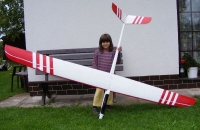 Moje "vlajková loď". Zatím se spíš seznamujeme, přece jen je to už trochu větší než moje běžné 2-metrovky. Létá pěkně, seřízení trvalo trochu déle. Je to tak trochu autobus, i když to umí i rozjet.