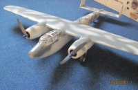 Váha vyšla dost vysoká, nějak se to nasčítalo: podvozek, stříkací tmel, plnič a vrchní lak. Křídla jsou potažená vliesem a trup včetně výškovky, směrovky a motorových gondol jsou polepeny mikelantou. Akumulátor má rovněž skoro 200g. Díky vysokému plošnému zatížení se to chová opravdu jako stíhačka.
