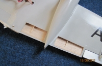 - největší chybou je však návrh ovládání ostruhy. Pokud se provede dle návodu, tak ostruha bude fungovat opačně než směrová kormidla (já jsem si to nezkontroloval a pak jsem musel kuchat hřbet trupu nad ostruhou - původní způsob ovládání předpokládal připojení páky ostruhy přímo k táhlu pro ovládání směrových kormidel. Jednoduché řešení, které jsem použil, spočívalo v použití dvojramenné páky na servu a ovládání ostruhy samostatným táhlem.