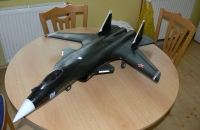 Materiál EPS,jenoduchá stavba. Po prvním pokusu o let jsem vyměnil setové motory Turnigy za nové od Pelikána.Model je pěkný,ovládaný pouze dvěma servy (delta mix) + servo na přední kolečko.Další pokusy mě teprve čekají.