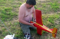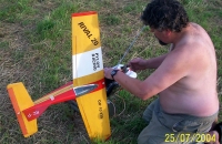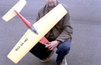 V balíčku který dostal každý účastník VCM 1980 byl kromě jiného i výkres modelu Rival kategorie RCP-Club20. Já jsem tento plánek dostal od Ládi Hrabánka a díky němu jsem byl nakažen virem Pylonus racerus. Po mém „veleúspěšném“ vystoupení na VCM v roce 1981, viz. mé jiné album, jsem se pustil do stavby hned tří Rivalů. Vzhledem k tomu, že můj brácha se infikoval též, zvýšili jsme obrat místní prodejny stavebnin nákupem polystyrénu a v ulici se začalo šuškat, že budeme zateplovat barák. Nicméně brácha se z toho dostal a tak zůstala jen má trojčata. Model byl opravdu promyšlené konstrukce (Jak jinak u J. Bílého) a všechno mělo svůj účel. Křídlo mělo negativy, motor byl vykloněn 45 stupňů ze svislé roviny, takže tlumič směřoval perfektně pod křídlo, tvar spodku trupu umožňoval modelu přežít i dost strmý úhel přistání. V první polovině osmdesátých let to byl nejrozšířenější malý pyloňák a i poté se křídlo používalo na dalších strojích. Bratři Malinové s tímto modelem poněkud upraveným vydrželi celou éru RCP a málokdy našli přemožitele. Já se v průběhu stavby několikrát přestěhoval, a nakonec jsem zakotvil zpět na Vodolce. Tady se ukázalo, jak je virus nakažlivý a tak mu podlehli další modeláři, viz foto č. 3. No a tak jsem jedno z trojčat věnoval Frantovi, na snímku vpravo, druhé jsem věnoval Jirkovi (snímky 4-8), uprostřed a na Zdeňka se už nedostalo a tak honem běžel do komůrky a tam se jal stavět Spitfira. Franta dokončil éro první a odlétal s ním poměrně úspěšně dvě sezony, nejprve s dvěapůlkou a později i 3,5-kou MVVS. Já jsem svého Rivala dokončil viz první dva snímky, ale díky prasklému lanku na výškovku jsem ho poměrně brzy rozbil. Jirka model sice dodělal, ale když pak viděl ten mazec, tak to rozchodil a uložil ho do komůrky! Pak si Franta postavil malého Mustanga a Rivala mi vrátil, takže jsem ho také zlikvidoval, bohužel už si ani nepamatuji jak, ale patrně mi na něj spadla zeměkoule. No a tak to vypadalo, že je historie konec. Ale nebyl, neboť jsem se v dalším miléniu tuším v roce 2002 setkal na Mělníku s třetím sourozencem, když ho tam Jirka prodával. Za tři stovky jsem ho koupil, trochu poupravil, osadil Maxíkem .20 RC a začal si to užívat. Až na relativně malé řídící plochy to byl moc fajn model. Dodnes jsem přesvědčen, že je velká škoda, že plánek nevyšel v Modeláři, nicméně modely Cimrman Fakir a Fiakr jsou v podstatě variace na dané téma. Jenže neštěstí nechodí po horách, ale po lidech a tak jsem jednoho dne o model přišel, když mi odešly baterky. No a tak jsem zlikvidoval i poslední z trojčat. A to jsou tedy ty nevyzpytatelné cesty osudu.