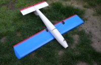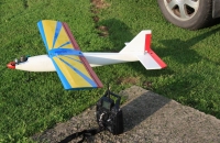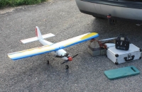 Aneb ať děláš co děláš osudu neutečeš. Když se na modelbazaru objevila nabídka viz první dvě fotografie, vzpoměl jsem si opět na pohodové a plnohodnotné létání s tímto modelem, viz foto 3, byť tehdy bez křidélek a nebylo to poprvé. Před časem se mi dostala do rukou stavebnice, ale stále jsem se nemohl dostat k tomu model postavit, a tak jsem jej nakonec prodal a nový majitel si Trenéra postavil velice pěkně, o čemž se zde můžete také přesvědčit. No nakonec jsem se s prodávajícím dohodl, že mi model nechá na Vodolce u příbuzných a já až tam budu mít cestu si jej odvezu. Takže vlastně taková koupě zajíce v pytli, ale vzhledem k ceně jsem to risknul s vědomím, že jsem již v životě přišel o víc. Nicméně když se mi model konečně dostal do rukou, byl jsem vcelku mile překvapen jak zpracováním, tak celkovou zachovalostí modelu. Křídlo bylo na každé polovině vylehčeno třemi velkými otvory, trochu je to vidět zejména na druhé fotografii, a ocasní plochy byly z balsových lišt pouze potažené folií, takže také lehčí než původní z polystyrenu potaženého dýhou. Tady bych chtěl prodávajícímu poděkovat. No, po vzevrubné prohlídce jsem došel k tomu, že je potřeba namontovat řiditelnou přední podvozkovou nohu, větší nádrž, zvětšit hloubku křidélek o cca 10 mm, a zmenšit mezeru mezi křidélky a křídlem o cca 3mm. To samé udělat i u směrovky. Při zkoušce montáže motoru pak ještě vyplynula potřeba vyosit motor poněkud doprava. No a tak jsem se do toho pustil. Z křídla jsem odřízl 15 mm a vlepil 5mm balsu. Vyhobloval jsem nová křidélka a náhony udělal jako torzní se servem zespodu. Nárž je uložena v laminátové trubce a tak jsem při představě jak to budu kuchat opustil myšlenku na 15-ti minutové lety. Také směrovku jsem nakonec nechal původní, neboť jsem si říkal, že křidélka mi s problémem pomohou a úpravu směrovky je možné udělat kdykoliv dodatečně, pokud by se to ukázalo nezbytné. Po dokončení se váha zastavila na cca 2040 g. V modelu je zdroj z pěti tužek AA. Vzhledem k tomu, že je jimy model vyvážen je zbytečné používat lehčí zdroj, protože bych musel přidat olovo. Těžiště mi vyšlo v cca 29% SAT a to mi intuice říkala, že je to akorát. Hledat plán ani počítat se mi nechtělo. Plošné zatížení vychází 65g/dm2, což je stále ještě snesitelná hodnota. Horší je to s hmotností na jednotku výkonu, takže bylo jasné, že nějaký vyšeptaný motor nemá šanci. Namontoval jsem 3,5-ku Brno, s tím, že může být nahražena 4,6-kou, No a to je k stavbě tak asi vše.