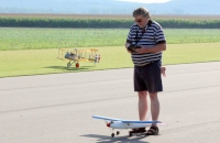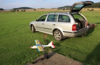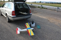 Dnes , respektive už včera jsem provedl zálet na dráze u Činova. Nádrž byla prázdná dřív něž jsem se nadál, a tak z toho byl nouzák a ještě do pole. Co tam rostlo nevím, ale po sklizni tam zůstaly pahýly jak telegrafní sloupy, což mě přinutilo přesunout se na letiště do Bolešin. Vašek zrovna posekal, ale i tak to pro třiapůlku bylo na hranici. Model je ale obratný, dostatečně stabilní, ale dost rychlý. Jediné co tedy udělám, že trochu svěsím křidélka, aby to mělo menší minimálku.
