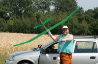 Tento větroň sem dávám z nostalgie, bylo to první letadlo s nímž jsem letos v červenci vzlétl ( a vůbec poprvé, nepočítám lli jeden skoro let asi v 15 letech) a byla to chyba, dnes vím, že takový konstrukční větroň nepatří do ruk nikomu, kdo ještě neletěl, ale někde jsem zaslech, že ano, tak jsem podlehl a taky byl první po ruce. Už není, tedy je, ale ne letuschopný, je opraven, ale už nemá snahu letět, asi jsem někde nedal už dohromady geometrii, První let, pád do lesa, opraveno, druhý let, pád do pole Video zde: http://www.stream.cz/uservideo/603138-vetron-zelena-srsen Zabodnut v poli cca 15 cm a pak i přes opravu už letu neschopen. Dal jsem ho sem abych měl svou galerii kompletní. :) Škoda ho. Budiž mu dílna lehká.