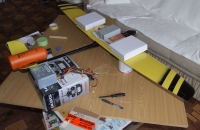 10.3.2013 Zalepeny špalíky z překližky na přišroubování serv, pro která jsem udělal z duralu vinglíky, pro uchycení naležato. Křidélka mají zalepeny gripy. Moc se netěším na frézování a umístění táhla pro klapky. Vyfrézoval jsem do křídla otvor pro MPX konektor.