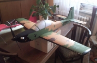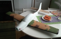 Základem je zelený tvrzený polystyren na křídla i trup vyztužený smrkovýma lištama. Trup je slepený ze dvou polovin. Náběžka, odtokovka a celá výškovka jsou polepeny hnědou olizovací páskou. Křídlo se připevňuje zespoda pojištěný šroubem vzadu. "Maketová" kabina je chycená magnety. Nakonec vyšlo asi o 100g těžší než bylo v plánu, ale motor má naštěstí výkonu ještě dost, stoupá krásně. Ještě by to chtělo průhlednej překryt kabiny, snad do budoucna taky bude...