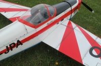 striekaný acryl autolak polomatný. Model som pred pár rokmi kúpil ako nedokončenú stavebnicu pravdepodobne Českej produkcie. Keď mi prišiel z Prahy , bol vo veľmi zlom stave a tak zo zúfalstva nad kúpou zbastleného modelu som ho odložil na celé dva roky. Na začiatku poslednej zimy som nabral odvahu a pustil sa do toho . Najskôr odstrániť všetko nepodarené : poťah,podvozok , prepážky trupu,lanovody, závesy ,no skrátka bolo to kruté. A konečne ideme na to , krídlo dostalo nový maketovejší podvozok a hlavne poctivo uložený,nový poťah z hnedej papierovej pásky, nové koncové oblúky ktoré sú prelaminované rovnako ako centroplán. Kormidlá majú konštrukciu rovnakú ako krídlo.Trup dostal pozdĺžne výztuhy, osem prepážok a to všetko v kombinácii smrek+uhlík a preglejka+uhlík. Povrch papierových častí je lakovaný Nitro lakom a celý model prebrúsený. Napokon som striekal celý model polpmatnou farbou ktorú som si dal namiešať podľa vzorkovníka RAL. Nekonečné maskovanie a striekanie mi zabralo 5 dní. A už len osadiť model, motor MVVS 30IFS skvelý výrobok, servá, dva krát zdroje a ideme na to . Letové vlastnosti realisticky podobné predlohe, motor skvelo pracujúci z dostatočným výkonom. A spôsob prepravy ??, takto vozím benzínové modely už druhú sezónu , nepáchne v aute a idem z domu už z pripraveným modelom ,takže na letisku nemusím zúfalo hľadať spadnutú skrutku v tráve. Asi taký model nebude možné voziť na streche FIAT PUNTO, osobne to mám na svoje ,,letisko " asi 0,7km. Ďakujem za pozornosť.