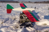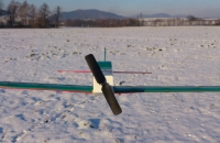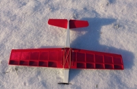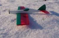 Doufal jsem, že se vlezu do 100g letové hmostnosti a to se kupodivu podařilo naprosto přesně. Při pečlivém výběru balzy a dalších úpravých by nebyl problém dostat se i pod 90g. Pokud jde o pohon, tak ten jsem zvolil ve variantě inrunner, aby motor nemusel trčet venku. Celý pohon váží 40g a příkon jsem neměřil. Nicméně se model "uvisí", ale moc rychle nelítá. Možná zkusím ještě vrtuli 3x3. Motor se nějak moc nehřeje, ale během záletu v teplotě asi -7°C mi regulátor vypnul asi po třech minutách, takže nějakých 6A tam asi bude. Zajímavosti vrtulky je to, že na hřídeli je jen nasunutá a přesto drží celkem spolehlivě. A druhým překvapením bylo, jak moc byla nevyvážená a jak špatně se pochopitelně vyvažuje. Dělal jsem to metodou pokus/omyl až do doby, kdy už to je "celkem dobré". Protože nevyvážená by mi celé letadýlko brzo rozložila, bo se to třáslo jak se spalovákem.