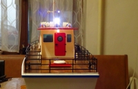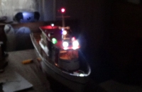 Osvětlení zůstalo jak je měl uděláno pan stavitel,jen se vyměnilo za funkční,které má 2 okruhy a zapíná se pomocí dvou serv a mikrospínačů.Skládá se z osvětlení domku,pozičních světel,pozičního světla na stěžni,modrých blikavých ledek na stěžni a bocích,2 reflektory přední,1 zadní a osvětlení zadní části paluby.V reflektorech jsou použity LED diody s vysokou svítivostí.Na fotkách je stav těsně před dokončením,chybí ještě nějaké doplňky.Na zítra je plánovaná první plavba.Omlouvám se za kvalitu fotek,na naši techniku byla velká tma:-)Juris.
