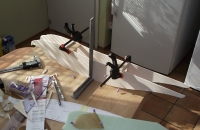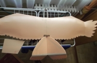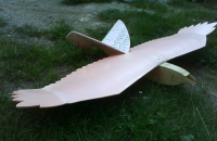 Planek sem našel na netu.V CADu sem si zakladní rozměry zvěčil a tvary domaloval tak nějak od oka.Těžiště sem trochu posunul dozadu oproti planku.Jinaj je toho dost na rc grops a taky na netu.trup sem si upravil tvarově aby vyšel z jednoko prkynka balzy.Profil křídla je KLARK Y,přizpusobenej na hloubku křidla.Prostě to byl takovej pokus jestli vubec poleti a dost mě překvapil v termice a reakci ostatnich dravcu.Taky se stalo že se dva dohadovali ktery kaně su já ve vzduchu,ale já měl už složeno v autě.