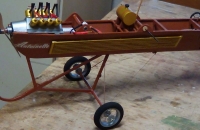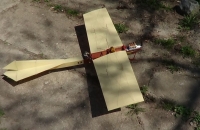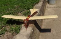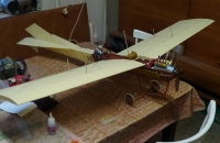 A přišel den záletu,na který se Sláva vypravil sám na místní hřiště.Meteo podmínky ideální,tak vzhůru do oblak.Start z trávy proběhl zcela bez problémů,Teta je přemotorovaná.Po nastoupání byl stroj uveden do levé zatáčky,ve které se levé křídlo vysunulo z trupu,páč tak nějak nebylo zajištěno a bylo vymalováno.Po dopadu olovo v trupu udělalo z jeho přední části hrst brnkátek,jedno křídlo se zlomilo.Vše se podařilo opravit k nepoznání a přišlo na zálet č.2.To už celkem čestvě foukalo,ale co bychom nezvládli...Položil jsem milou Tetku do vzduchu a ta nám asi po 20 m letu zamávala křídly,jedno se zlomilo a bylo po záletu.A tak se Sláva víte co...,a ke slovu přišla pořádná modelařina.Byla postavena nová křídla,klenutý profil,více žeber nosníky nahoře,nosníky dole a potah z obou stran.Nyní jsou křídla zajištěny gumičkou,jak je vidno na poslední fotce.Zálet č.3 už pak byl naprostá lahůdka,člověk by neřekl,jak to koště dokáže krásně pomaloučku brázdit vzduch.Takže konečně maximální spokojenost.Teď už se s ní chodí bez obav i do větru,letí bez problémů,není třeba se s ní nijak rvát.Přistává pak jako vrtulník.Autorem videa je náš kolega borsoj.Dle pamětí kolegy Slávy sepsal Juris.PS:montážní prkno právě obsadil další kousek od SIGu Deperdussin.