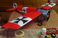 Model je po natření konstrukce Balsalockem potažený Litespanem.Stříbrné části jsou po zakytování potaženy tenkým Modelspanem,lakovány a stříkány autolakem.K výrobě křížů se použil silný obarvený Modelspan.K přilepení je použitý řídký Herkules.Drátěné výztuhy se natáhly z černé režné nitě,v místech ukotvení jsou kousky gumové nitě.Z ní měly výztuhy původně být,ale je silná a nevypadalo by to dobře.Pilot se koupil u Topmodel.cz,přes ramena dostal pásy a za záda opěradlo.