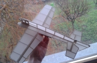 Je to príjemná práca, ale niektoré priečky v trupe som nenavrhol rozumne a na niektorých miestach sa poťah krčí a nevypne to ani napínací lak, kedže dané miesto nie je poriadne vystužené. Hranoly sú 3x3mm, ale na ďalší model postačia určite tenšie, aj keď kostra sa zdá byť jemná, papier a lak ju podstatne vystužia. Na pláne je ďalší test s litespanom, žehlí sa a hmotnosťou aj pevnosťou by mal byť rovnaký ako nalakovaný papier.