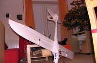 Rychlostavebnice větroně z elaporu. Je potřeba jen spojit křídla uhlíkovou trobkou, přišroubovat výškovku, připojit táhla a konektory...a hurá do výšin. Velmi pěkně zpracované éro, jensnad několik poznámek: já měl trup zkroucený..tzn. výškovka byla vůči křídlům nakloněna- pomohla domluva kroucením rukama na opačnou stranu- je potřeba zkontrolovat před dalšími lety ( paměťový efekt ). Hrany křídel měly po vypěnění ve formě hrany- ožezáno žiletkou a zabroušeno ( náběžná hrana ). Původní regulátor jsem ihned vyměnil za jiný 30 ampérový ( původní měl nepěknou vlastnost- pokud jste nešáhli na plyn cca. 3 min- odpojio se napájení motoru a nešel spustit, až po opětovném zapojení baterie ) Dále je vhodné kabely od motoru k regulátoru uvnitř trupu zajistit skelnou páskou, jinak hrozí jejich zachycení a prodření otáčejícím se motorem. Také jsem pojistil vidličky připojení pák navlečením bužírky. Letový projev prostě paráda....zalétnuto tuto neděli- pouze jeden start- naprostá spokojenost. Jen ta přeprava a balení...dvoumetrový model je přece jen malinko větší než vše co jsem dosud provozoval, ale ten majestátný pohled když je ve vzduchu to vyváží.