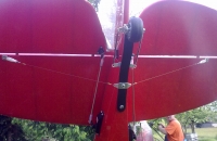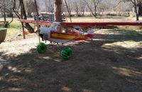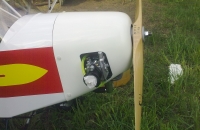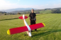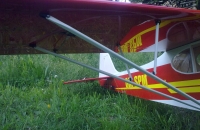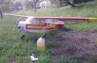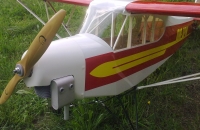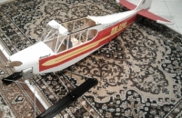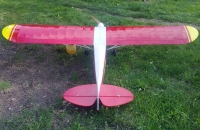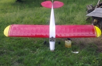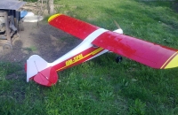 Takže zálet sa uskutočnil. Lieta to ako... Piper :) Pohodové lietadielko. Vďaka veľkým kolesám lietam blýzko domova na pokosených lúkach a nemusím sa trepať na vzdialené letisko. Motor funguje perfektne na nízke aj vysoké otáčky. Vymenil som vrtuľu za 18x7. Teraz má max otáčky cca 7200/min. Vdaka tomu že má nízke plošné zaťaženie lieta príjemne pomaly. Zároveň musím poznamenať že to nie je model do veternejšieho počasia. Spojazdnil som na ňom aj pumovnicu a vlečný háčik na ťahanie transparentu ( v buši sa predsa všade pristáť nedá a niekedy treba náklad zhodiť na padáku :) ) Tým stúpla hmotnosť na cca 5200g. Dúfam že mi dlho vydrží bez toho aby som ho načal.