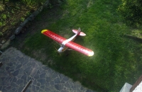 Môj druhý benziňák. Staval som ho celú zimu po večeroch podľa upraveného plánu z internetu. Pôvodne bol stavaný aby som využil upravený motor z krovinorezu Stihl. Potom som zistil že som model postavil veľmi lahký a musel by som do chvosta veľa dovažovať. tak som ťažký krovinorez predal a kúpil z číny Turnigy 30cc ako náhradu. Teraz celý model váži len 5100g. Mimochodom celé vybavenie až na Tx a Rx je z číny, vrátane bižutérie a poťahovej fólie. Mal som problémy s motorom, lebo som nedal na rady aby som vymenil v motore ložiská. Nepokladal som to za potrebné lebo v predchádzajúcom motore RCG50 sú kvalitné japonské ložiská a nie je s nim žiadny problém. No v tomto motore boli ložiská nalisované tak natesno že išli z tuha a musel som ich vymeniť za volnejšie. Ajtak to nebolo ono ale postupne sa zabiehajú. Už som motor skúšal aj v lietadle, a ide krásne, Lietadlo pekne pohltilo vibrácie a zdá sa mi že na benziňák ide veľmi kultivovane. V krátkej dobe bude nasledovať zálet.
