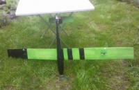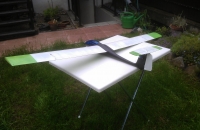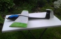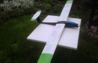 Olétaný laminátový trup jsem kdysi dostal od známého, původně to byl jen větroň. Pořád mě bylo líto se ho zbavit. A až loni došlo na to, že jsem se do něho pustil - schrastil jsem plánek na hodně podobný stroj. Původní střeva z trupu vykostil a plovoucí výškovku předělal na pevnou. A ještě po dilematu, jak ho dostat do vzduchu jsem fiknul špičku a přidal elektromotor. Křídla jsem zkusil udělat polystyrénové s balzovým potahem, ale ve stadiu pokusu vyšly tak těžké že padla volba na konstrukční a s křidélky. Postupem doby jsem ještě provedl několik úprav a minulý týden větroň konečně letěl. Tehdy ještě bez nátěru a bez křidélek. Vyšel trošku těžší, a díky nízkému profilu je let svižnější. Opravdový zálet bude po zlepšení počasí. Tak uvidíme.