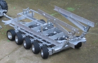 Přívěs 5 náprav z toho první pevná, ostatní řízené s automatickým nastavováním úhlu natočení kol dle rádiusu zatáčky. Vše vyřešeno pomocí soustavy pák. Přívěs tak zatáčí bez odporu, velice lehko. Odpružení náprav pomocí listových pružin.